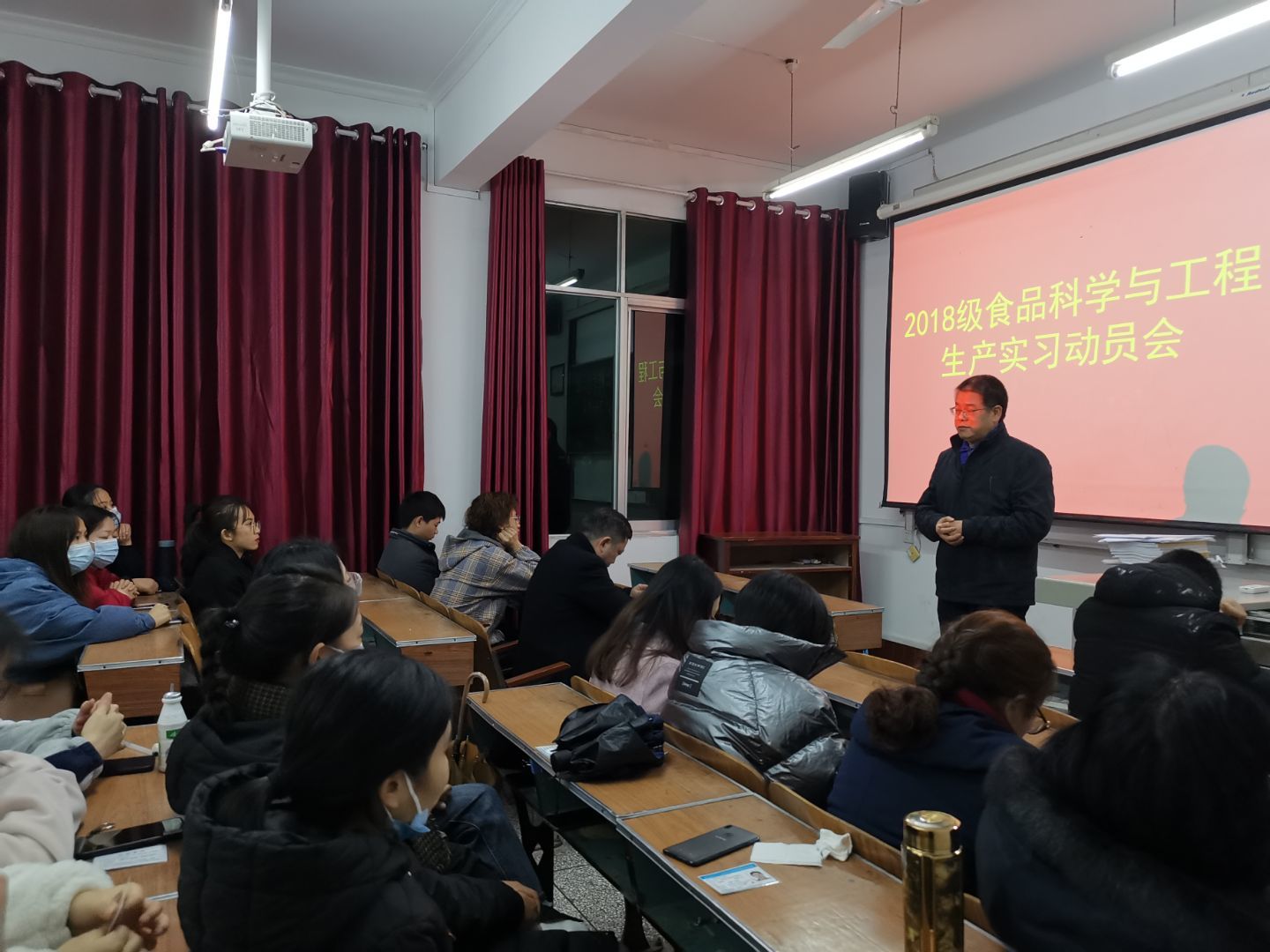 (本网讯 程超/文 朱玉昌/图)12月2日晚,2018级食品科学与工程专业生产实习动员大会在4303教室召开。学院副院长周志、办公室主任陈根洪、食品科学与工程系主任程超、实习带队老师朱玉昌、班主任陈杰及食品科学与工程专业全体教师参加了会议。