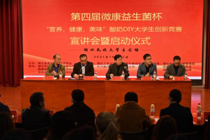 (本网讯 杨婷雅/文 蔡怡琳/图)10月21日下午,由湖北省食品科学技术学会主办,我院与微康益生菌(苏州)股份有限公司及华中农业大学食品科学技术学院联合承办的第四届微康益生菌杯酸奶DIY大学生创新竞赛启动仪式在我校文传院演播厅顺利举行,华中农业大学分会场同步直播。
