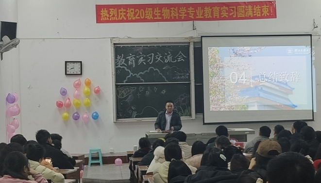 本网讯 师范教育实习是师范教育专业实践教学的重要环节,是师范专业将理论与实践紧密结合的重要手段之一。我院于2023年12月29日下午七点在4202教室开展2020级生物科学专业师范教育实习交流会。本次交流会由生物科学专业负责人武芸主持,学院副院长周毅峰,副院长罗凯、教学科科长卢婵、学生科科长陈杰、高级实验师周光来、生物科学专业的所有老师和生物科学专业各年级全体学生出席会议。
