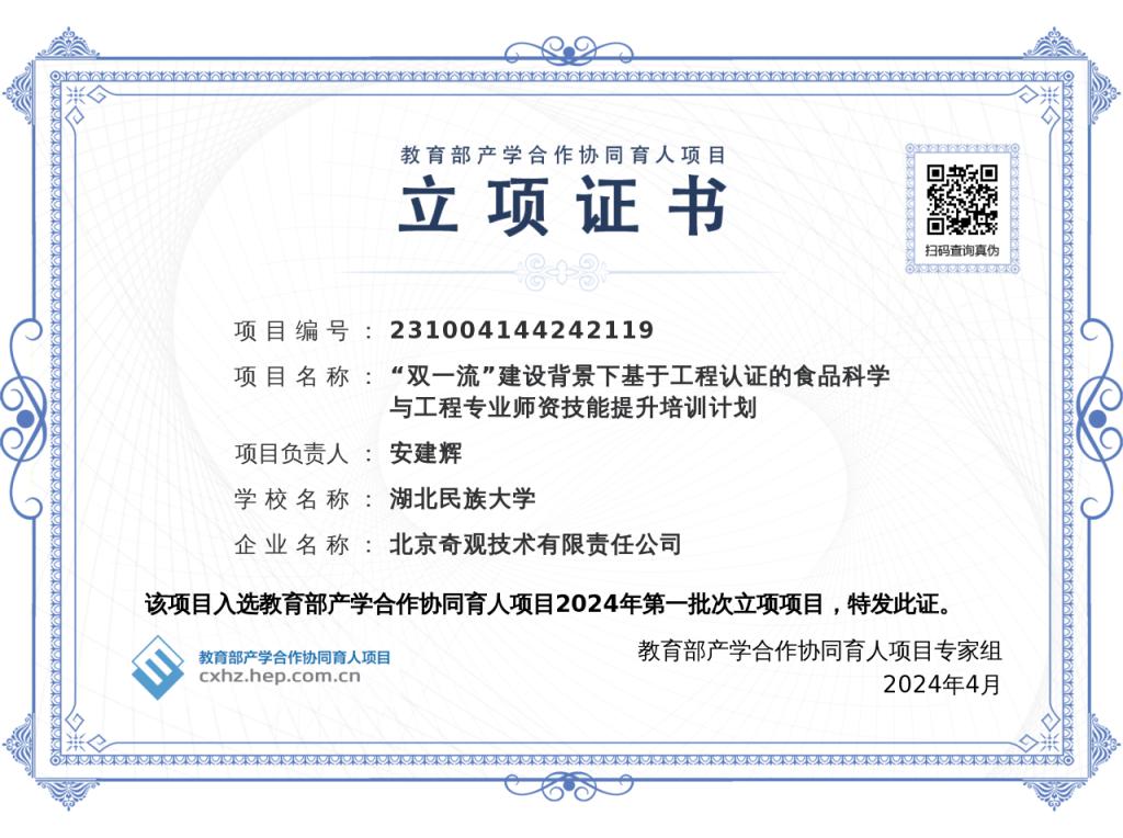 近日,教育部高等教育司下发《教育部高等教育司关于公布2024年第一批产学合作协同育人项目立项名单的通知》,我校共获批19项。我院安建辉申报的《“双一流”建设背景下基于工程认证的食品科学与工程专业师资技能提升培训计划》喜获立项。