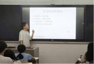 在4102教室,马国樑和巴琴带来精彩分享。马国樑详细讲述备考时间线规划,涵盖基础、强化、冲刺阶段,还分享各科目备考秘籍以及心态管理的实用方法。巴琴则围绕考研流程、初试备考、调剂经验、复试技巧展开,以清晰的时间轴和详细的策略,为同学们绘制了一幅考研全景图。