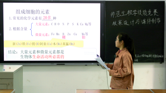4302教室举办教案设计与课件制作赛道,生物科学专业教师雷红灵、王海波以及19级优秀学生付昕怡应邀担任此次评委。参赛选手按顺序在现场进行5分钟课件现场展示,并回答评委老师提问,评委则根据对教案设计、课件的审阅和选手答辩的表现现场进行三个项目的评审。其中,20级生物科学专业姚紫妍、李甜甜在展示PPT过程中时间分配合理,教学重点突出,启发学生思考与参与,有突破教学难点的策略,达到教师主导性和学生主体性有机结合的目标。