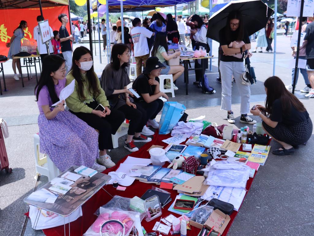 早上8点,各院学生按照摊位分配,将物资搬到指定区域开始售卖。摊位上的物品种类繁多,有学习用品、运动器材、生活用品、化妆用品等。物品大小也参差不齐,有饮水机这样的大物品,也有耳环、手办一类的小物品;各类用品物件琳琅满目,可谓是应有尽有。看着场上丰富而物美价廉的商品,选购者都想“先下手为强”,就怕晚一步购买就错失了此次良机;摊主之间也存在相当大的竞争,因此愿意给予顾客最大程度上的优惠,可“小刀”相互协商价格。大学生广场完美化身为“大学生市场”,便宜实惠的商品吸引选购者逛了一圈又一圈。一位参与者如是说:“这次活动真的很棒,让我在校园内体会到了集市购物的快乐,简直是剁手党的快乐新天地。”
