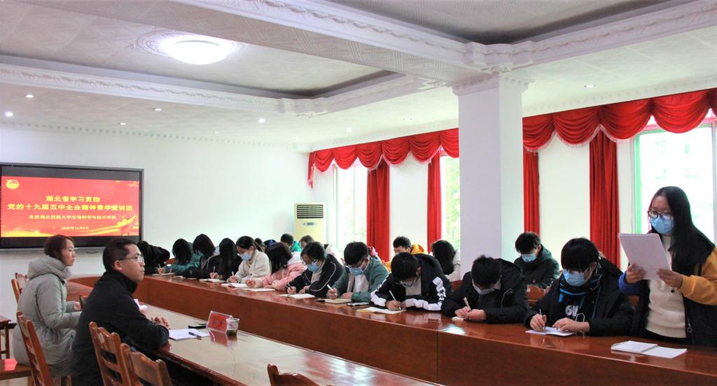 本网讯(见习通讯员 唐欣新 谭媛/文 柯佳译/图)12月8日上午11:10分,我院在二楼会议室成功举行党的十九届五中全会精神青年宣讲团活动。本次活动主持人为我院学生科科长彭璟。省青年宣讲团成员、华中农业大学植物科学技术学院副院长、博士生导师郭亮作为宣讲嘉宾应邀出席。
