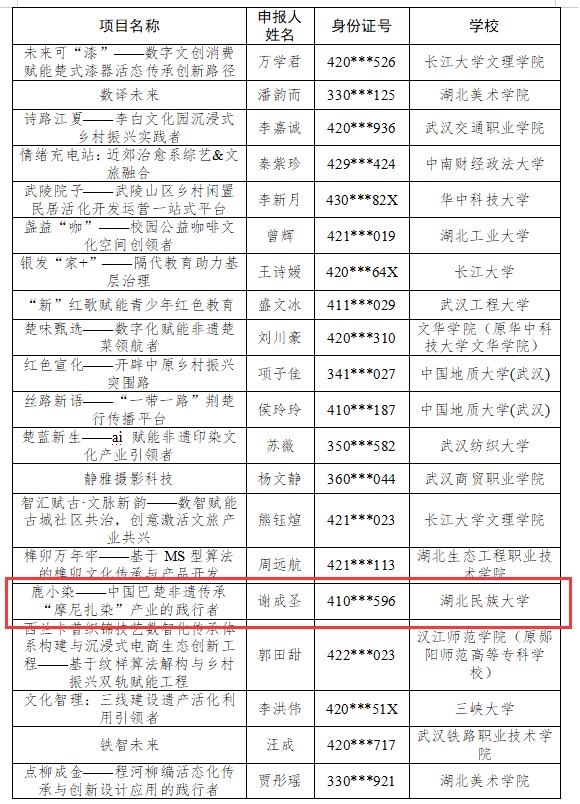 2025-11-06 08:35:43 点击量:近日,湖北省人力资源和社会保障厅公示2025年度湖北省大学生创业扶持项目创意组“金点子”项目名单,我校《鹿小染——中国巴楚非遗传承“摩尼扎染”产业的践行者》《基于富硒罗汉果的功能性产品研发与产业化运用》和《影驻韶华,镜纳桑榆——“老来俏”公益摄影》三项创业项目成功入选。