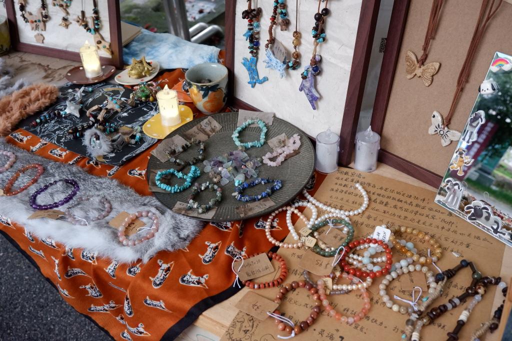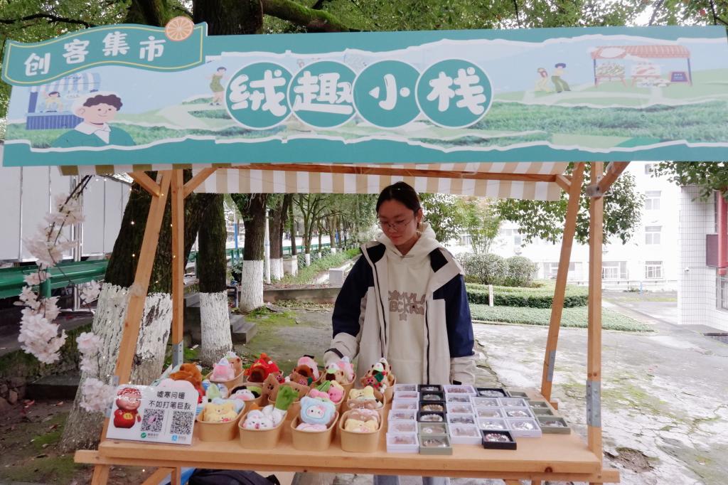 手作创意体验区同样人气高涨。这里不仅有可供DIY涂鸦的石膏娃娃、琳琅满目的彩珠供师生串制心仪的手链项链,还有柔软可爱的玩偶,以及以校园小猫为原型设计的“吧唧”和吊坠等文创产品。更惊喜的是,“小猫学长”也亲临现场,萌趣互动将氛围推向高潮。