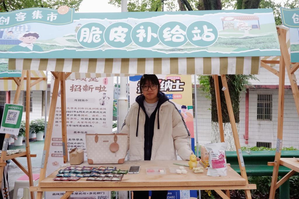 在养生青年专享区,小巧便携的茶包不仅设计贴心,冲泡后更在寒湿天气中送来阵阵暖意。此外,还有富含地方特色的恩施藤茶制成的茶饼,以及创业团队自主研发的水果富硒饮料,因其具有抗氧化、改善睡眠、延缓衰老等多重功效,吸引了大量师生驻足选购。同时,也有把脉问诊活动,便于师生及时调整。