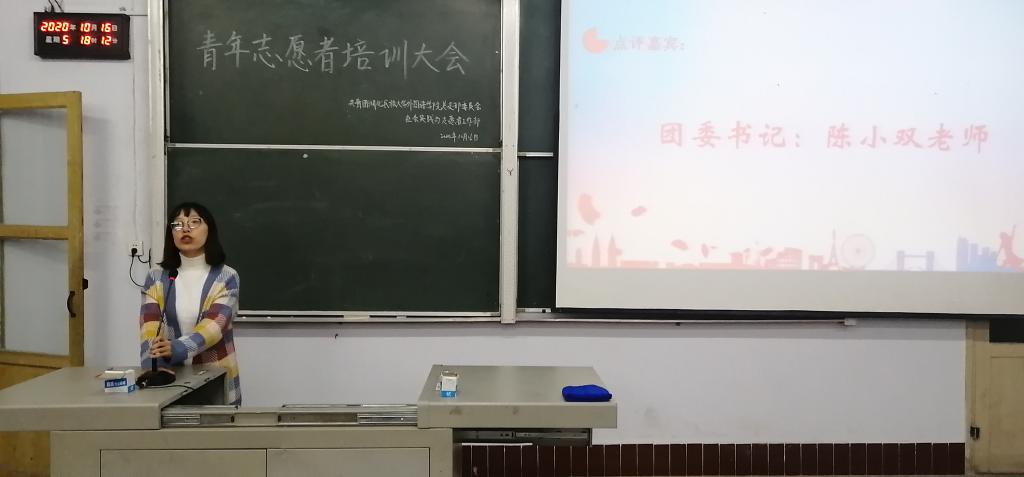 时间:2020-10-19 编辑:学生科 点击:(通讯员 龚倩 摄影 杨成成 杨胜丫)为践行志愿精神,展现青春风采,进一步贯彻落实党的十九大提出的“推进诚信建设和志愿服务活动制度化,强化社会责任意识,规则意识、奉献意识”,探索新时代志愿服务的完善与创新,从而更好地使志愿者们理解志愿服务事业,提高志愿者队伍的综合素质和服务质量。10月16日,共青团开云电竞官方网站入口外国语学院总支部委员会社会实践与志愿者工作部于6401教室成功举办本次培训大会。外国语学院近90名志愿者到场聆听,本次活动由团委书记陈小双老师,团委副书记向逸俊、李艳琴担任评委。