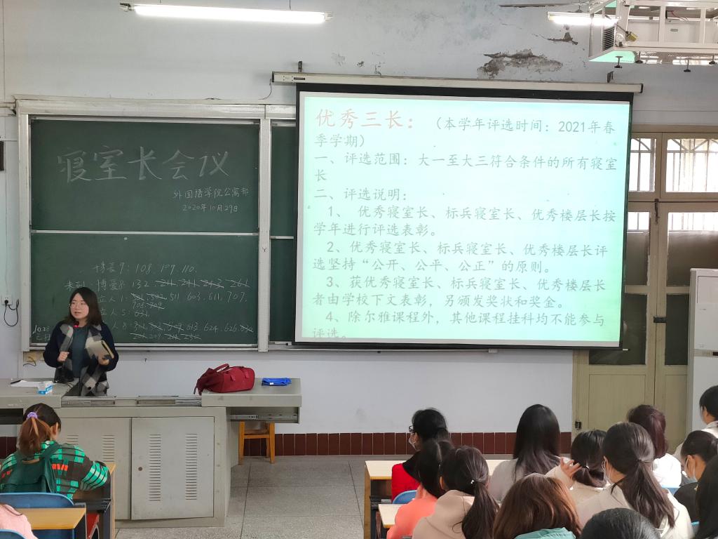 活动伊始,学生科田老师对寝室长会议的大致流程和注意事项做出了阐述。接着,公寓部部长周玮从寝室卫生检查、寝室安全排查、寝室报修、文明寝室标兵寝室评选标准及“优秀三长”几个方面进行简单的介绍。重点提出寝室卫生检查注意事项、评分标准及寝室排查内容。最后,外国语学院学生科老师田甜主要从寝室长职责、寝室卫生、用电安全、寝室文化方面进行了补充。