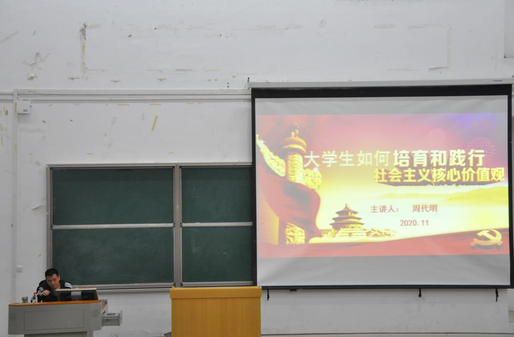 活动伊始,周代明书记从什么是社会主义核心价值观、深刻理解社会主义核心价值观的内涵及意义和大学生如何培育和践行社会主义核心价值观三个方面入手,向大家介绍社会主义核心价值观在国家、社会以及个人层面的具体内容及深刻含义;接着,他从勤学、修德、明辨、笃实四方面教育大学生只有深入学习和践行社会主义核心价值体系,坚持崇高理想追求,弘扬伟大民族精神,塑造文明道德风尚,才能健康成长为社会主义建设的有用之人。