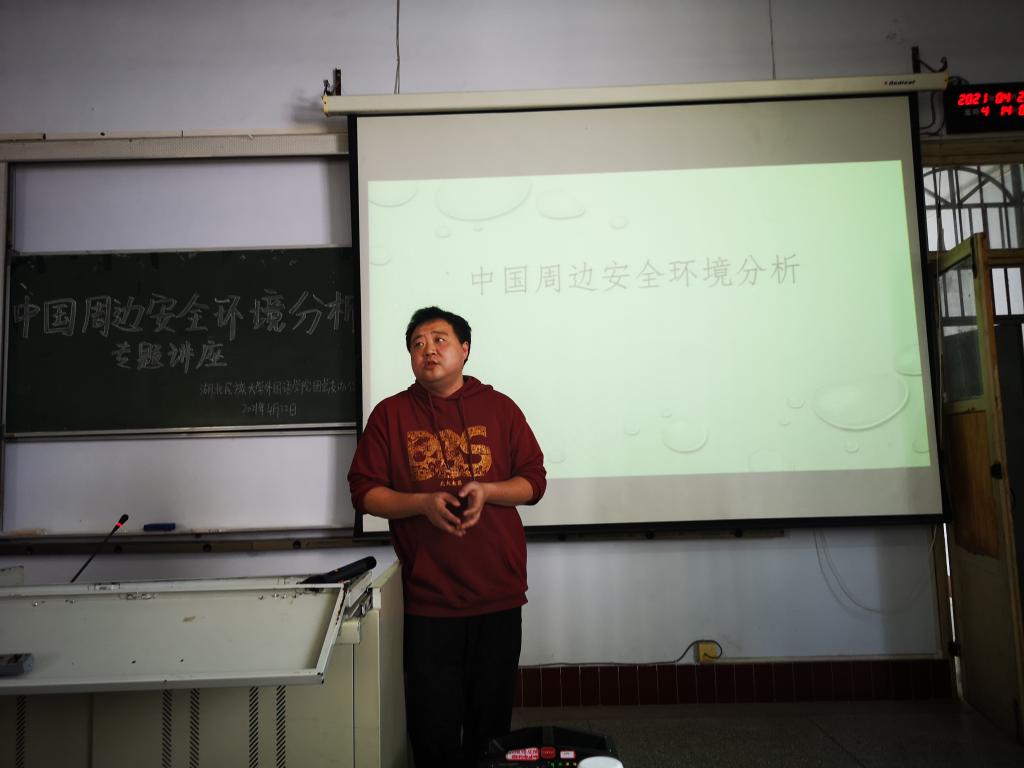 时间:2021-04-23 编辑:学生科 点击:本网讯(通讯员:胡进怡 摄影: 柴新宇 赵雪)为牢固树立学生们的国家安全观念,提高学生的国家安全意识,4月22日下午,我院于6402教室成功举办中国周边安全环境分析专题讲座,本次讲座主讲人为我院讲师李靖,李老师硕士毕业于中国人民大学,目前于北京大学就读博士,其主要研究方向为美国与东亚,城市外交和对外政策研究。出席本次讲座的嘉宾有学生科科长粟登平老师,学院团总支书记陈小双老师,学生科辅导员田甜老师。