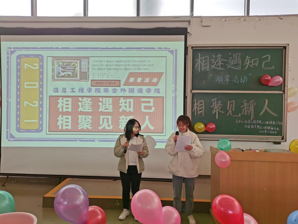 时间:2021-12-05 编辑:学生科 点击:本网讯(通讯员 余胡铃澜/摄影 王芷依)12月4日,信息工程学院心理健康协会联合外国语学院心理健康协会于我校修远楼5B509教室举行,2021年秋季学期朋辈活动。本次活动以“相逢遇知己,相聚见新人”为主题,旨在给同学们创造一个能够更多地了解学校、结交更多朋友的机会。两院心理健康协会全体成员参加此次活动,肖霖怡和谭舒蕾担任活动主持人。