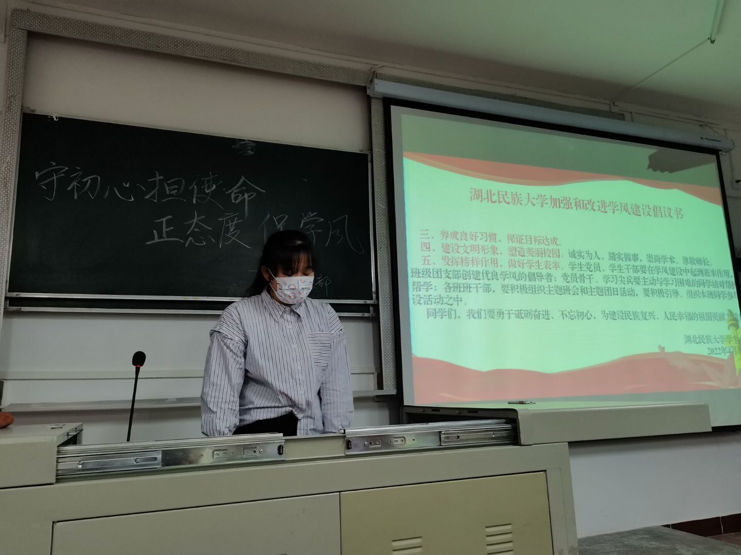 本次主题班会由班长带领全体同学学习学风建设倡议书。在开云电竞官方网站入口严谨的治学之风中,一代又一代民大人投身报国,在高山林海中抒写豪情,在日月星辰下矢志奉献,在艰难困苦中玉汝于成。而作为身处百年未有之大变局环境下的大学生,要做到强化主人意识,接续校园建设;树立远大理想,明确学习目的;养成良好习惯,保证目标达成;还要建设文明形象,塑造美丽校园以及发挥榜样作用,做好学生表率。尤其党员骨干、学习尖兵要主动与学习困难的同学结对帮扶、帮教、帮学;各班班干部,要积极组织主题班会和主题团日活动,积极引导、组织本班同学参与学风建设活动之中。