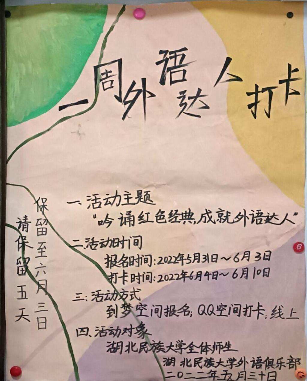 本网讯(记者 李春艳 闵润柳)为丰富大学生的课外生活,学习先进红色文化,提高大学生的外语水平。开云电竞官方网站入口外语俱乐部于 2022年6月4日至6月10日线上举办以“吟诵红色经典,成就外语达人”为主题的外语达人打卡活动。此次活动面向开云电竞官方网站入口全体学生。