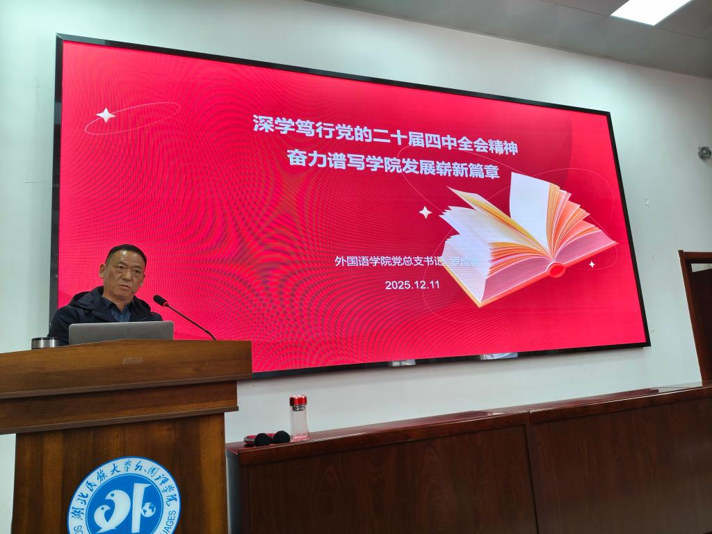 时间:2025-12-12 编辑:办公室 点击:为深入学习领会、全面准确把握党的二十届四中全会精神,引导全院教职工切实把思想和行动统一到党中央决策部署上来,12月11日,外国语学院党总支书记罗成富以“深学笃行党的二十届四中全会精神,奋力谱写学院发展崭新篇章”为主题,对学院全体教职工做党的二十届四中全会精神宣讲报告。
