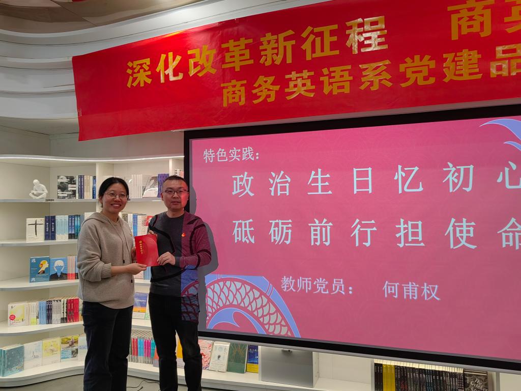 在民主议事环节,党员们围绕如何在商务英语系日常工作中贯彻党的二十届三中全会精神,展开了热烈的讨论。特色实践活动中,以“政治生日忆初心,砥砺前行担使命”为主题,为10月份入党的教师党员何甫权同志庆祝了“政治生日”,增强了党员的荣誉感和责任感。