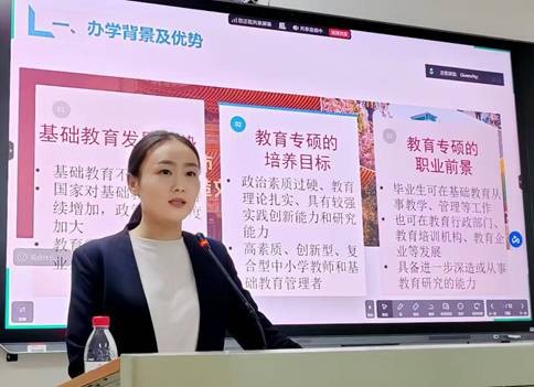 我院舒婧娟主任从学院的办学背景及优势,翻译硕士与学科教学(英语)两个学位点的培养方案、课程体系与设置以及报考优势等方面对线上线下的学生进行了宣讲。