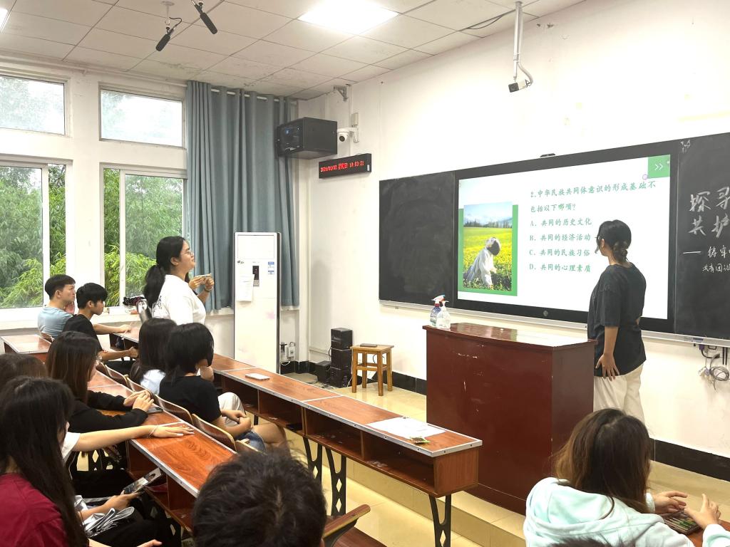 各团支部以影视剧《我的阿勒泰》为例,综合观影和互动讨论、理论学习等形式开展团日活动。主持人就介绍最近爆火的《我的阿勒泰》电视剧与书籍进行引入,通过观看视频与互动抢答增加活动趣味性,并就“五个认同”“三个离不开”“四个共同”“四个与共”等理论展开学习、互相交流分享心得,进一步加深了同学们对铸牢中华民族共同体丰富内涵的认知、强化了民族平等团结与共同繁荣意识。