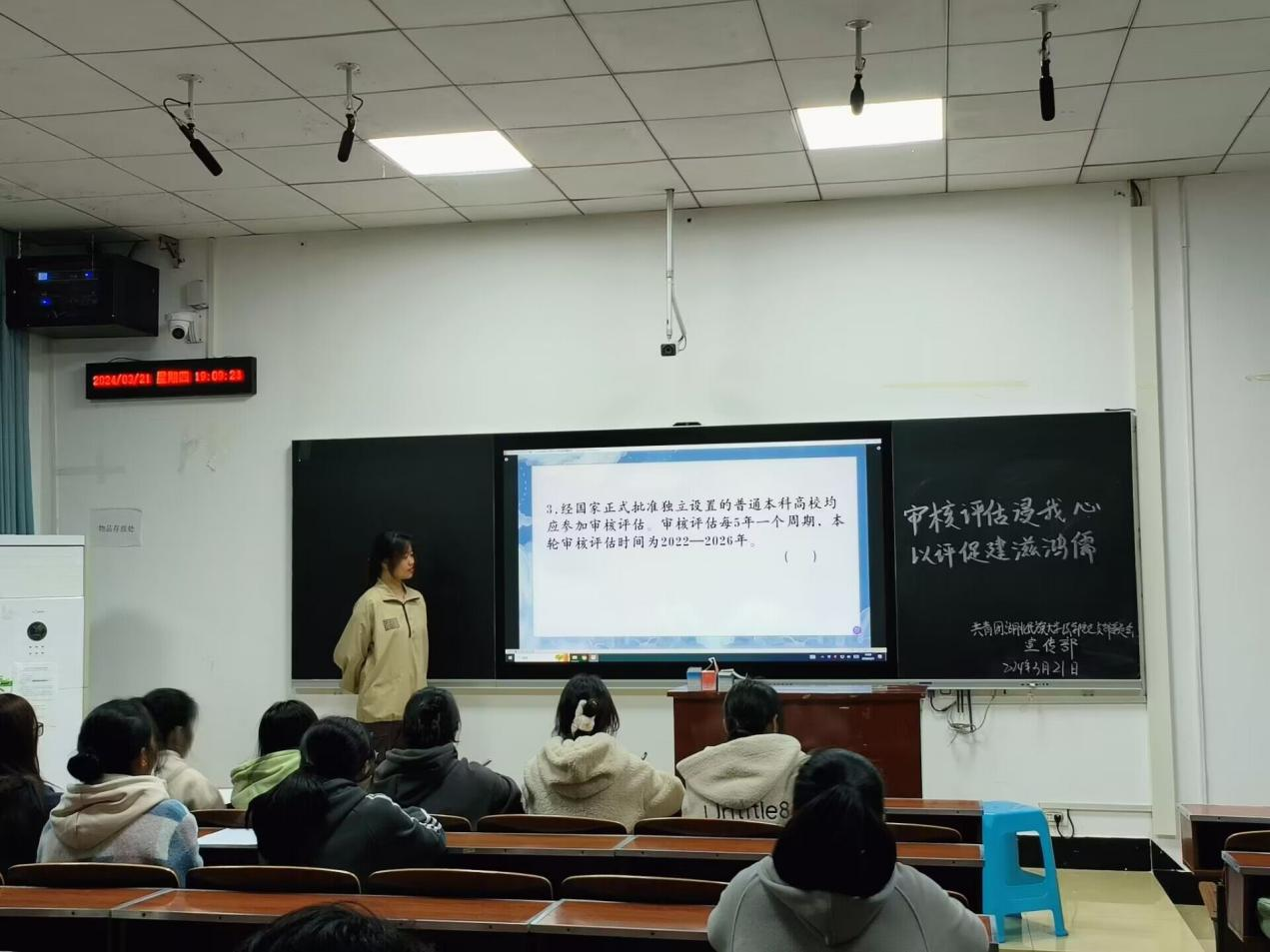 此次活动以什么是新一轮教育教学审核评估、其基本原则、指导思想等问题为切入点,通过知识竞赛让同学们对审核评估的理解更加深刻,促进同学们增强责任感和使命感,与学院、学校共同通过审核评估的契机以评促建、以评促改、以评促管、以评促强,积极构建自觉、自省、自律、自查、自纠的大学质量文化,营造争先创优的浓厚氛围。(编辑 谢学婧 审核 黄晓波 签发 张明波)
