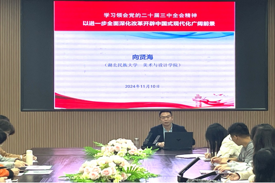 11月10日,美术与设计学院党总支副书记向贤海以“学习领会党的二十届三中全会精神-—以进一步全面深化改革开辟中国式现代化广阔前景”为主题讲授了一堂精彩党课。他鼓励青年学生要坚定政治信念、提高政治站位、树立远大理想、培养担当精神、刻苦学习知识、积极参加实践、服务社会大众、弘扬传统文化,帮助各发展对象对党的二十届三中全会精神有更深入的理解和认识。