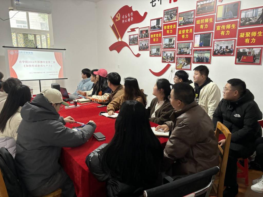 “最近经常浏览到一个新词‘新质生产力’,但是对它的内涵不是很理解,也不知道怎样和现在的学习相结合”。这是一名学生党员在2月支部主题党日交流环节提出的疑惑。对此,3月10日,法学院学生党支部、立人六栋党小组在博学四栋“一站式”社区开展“加快发展新质生产力 扎实推进高质量发展”理论研学活动,组织党员观看了六集系列微纪录片《加快形成新质生产力》,并分享各自学习的心得体会,让同学们从各行业发展了解到新质生产力诞生的源头和潜能。学生党员涂先阳谈到,通过观看视频我了解到科技自立自强是国家强盛之基、安全之要,要对科技工作者的不懈探索和辛勤努力表示感谢,是他们为高质量发展注入了源源不断的活力,让更多的创新成果得以落地生根,推动我们向着强国建设、民族复兴、生活美好的光明前景奋勇前进。