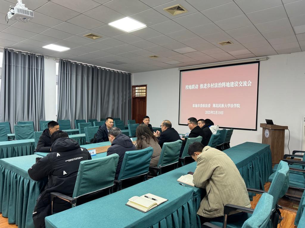 2月19日,恩施市委常委、政法委书记李华军,恩施市司法局副局长向成义、恩施市委政法委政治处主任龚清新一行莅临我院开展“校地联动”推进乡村法治阵地建设交流活动。学校党委常委、纪委书记张宏磊,学校党委委员、研究生部(处)部(处)长、学科建设与学位管理办公室主任汪燕,学院党总支书记张明波,副院长李文革,党总支副书记黄晓波,副院长蔡世鄂,知识产权研究中心主任杨信等参加了本次交流活动。
