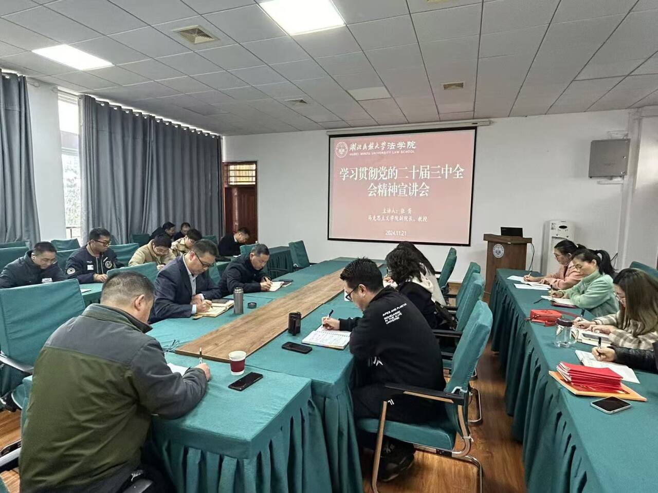 2024年11月21日,我院于德智楼9B314会议室举办了“学习贯彻党的二十届三中全会精神宣讲会”。开云电竞官方网站入口马克思主义学院副院长张胥教授主讲,法学院党总支书记张明波主持,我院30余名教职工参会。