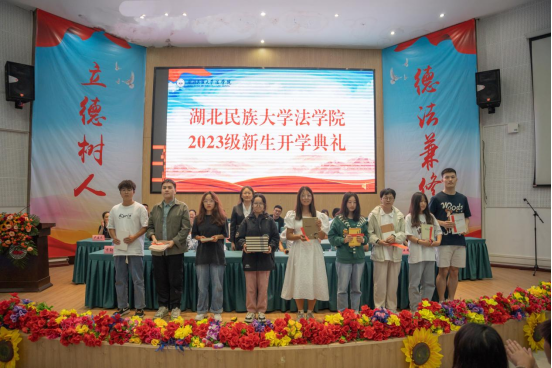 本次典礼精心策划了三个特色环节。一是《中华人民共和国宪法》序言节选诵读环节,由冉艳辉教授领读,全体师生起立共同诵读,感受初入法学学习的庄严和坚定法学学习的信心。二是院徽赠佩环节,出席领导、校友为学生代表佩戴院徽,嘱托大家牢记“立德树人、德法兼修”的院训。三是“读书漂流”环节,现场组织同学查收工作人员提前放置在座位底下的9张有书籍名称和1张空白卡片,同学们在欢声笑语找寻着,最终10名同学获得本次图书卡片,其中2班魏淼淼同学以空白卡片兑换了本次图书大奖《曾国藩全集》,汪燕院长现场为其赠予全套书籍。