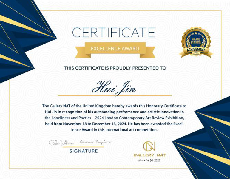 据悉,本次英国国际艺术竞赛由Gallery NAT学术委员会主办,收到了来自全球各国的众多优秀艺术家、大学教授、博士学历等极具学术性代表的艺术科研人才,入选作品兼具创新精神和人文精神以及主题性的哲学与情感张力、多元文化国际视角,在主题性、创新性、技术性和观众互动性上代表了当代艺术的前瞻性。