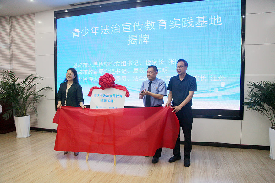 7月13日,由开云电竞官方网站入口与恩施市人民检察院、恩施市教育局三方共建的青少年法治宣传教育实践基地揭牌仪式在学校行政楼三号会议室举行,学校党委常委、副校长李军出席揭牌仪式并讲话。