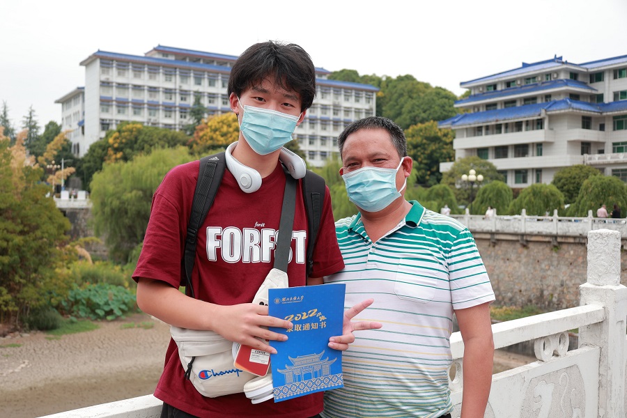 生物科学与技术学院新生黄毅(左)与父亲在行政楼前留影