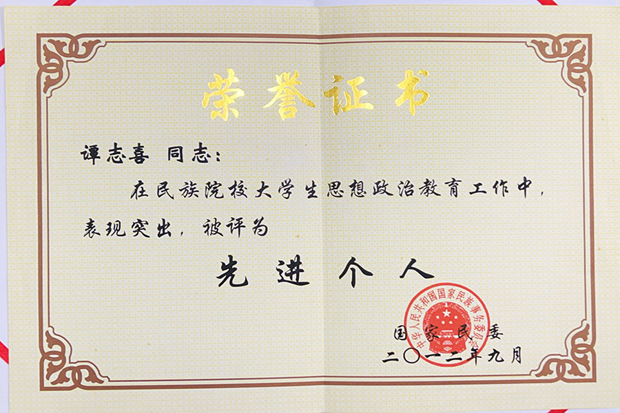 谭志喜扎根教育一线,用“爱心”工作法教育学生,先后获得校级“优秀共产党员”“优秀共青团干部”“优秀辅导员”、“优秀学生科长”“优秀教育管理工作者”等荣誉;2011年被省教育厅表彰为湖北省高校思想政治教育工作先进个人,2012年被国家民委表彰为全国民族高校大学生思想政治工作先进个人,被共青团湖北省委表彰为2015年“三下乡”活动先进工作者。谭志喜刻苦钻研业务,作为负责人,带领旅游管理专业应用型人才培养教学团队成功牵头申报为省级优秀教学团队。他指导的本科生毕业论文2篇被评为省级优秀论文,指导的学生团队获得1项省级实践竞赛一等奖。作为经济与管理学院分管教学的副院长,他为会计学专业国家级一流专业建设点、旅游管理专业成功申报省级一流专业建设点作出了重要贡献。