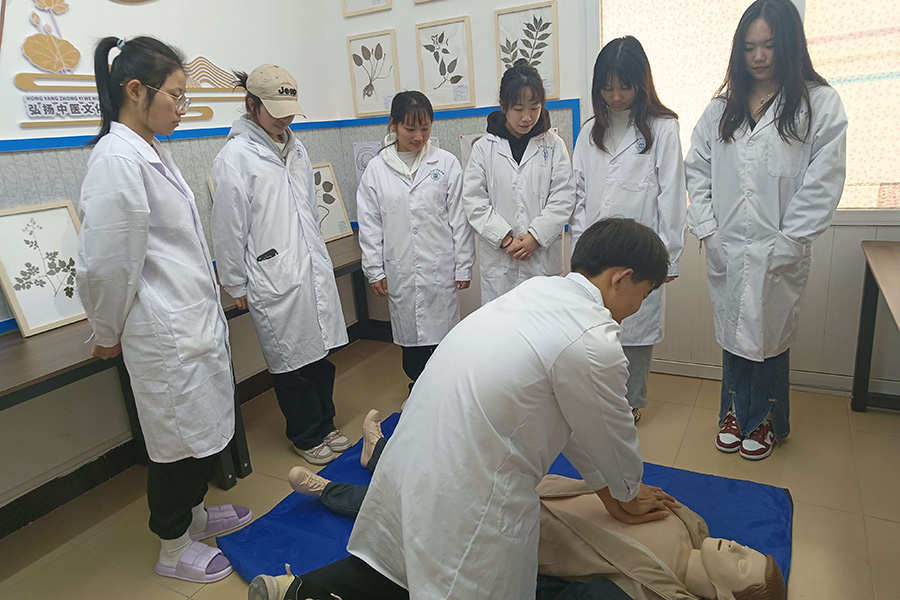 “扶面颊,看口腔,按压30次后,进行2次人工呼吸……”博爱活力社区“医学领航”工作室正在开展春季常见疾病预防知识宣传。医学部的同学们将心肺复苏、创伤包扎、海姆立克急救等现场急救操作等专业培训引入学生社区。