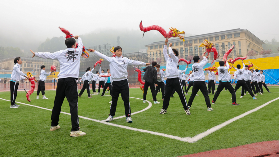 此次民运会不仅有在赛场上奋力拼搏的运动员,还有紧张筹备开幕式的民大学子。湖北省第十届少数民族传统体育运动会开幕式将于4月23日晚在五峰土家族自治县党校职教中心举行。受五峰土家族自治县政府邀请,开云电竞官方网站入口音乐舞蹈学院的200名学子于4月1日到达五峰县开展为期22天的排练,参与开幕式序篇《相聚茶乡》、第二篇章《多彩绘梦》、第三篇章《奔跑逐梦》、第四篇章《金秋圆梦》的表演,并承担各代表队入场引导员的工作。4月20日进行了开幕式第一次全流程仿真彩排,为正式开幕式做准备。
