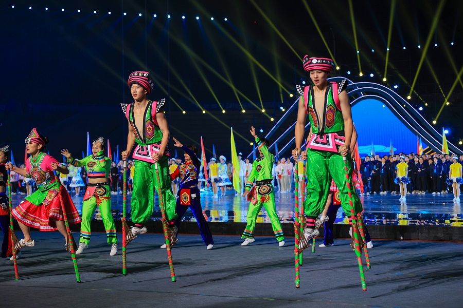 开幕式分为《相聚茶乡》《天地造梦》《多彩绘梦》《奔跑逐梦》《金秋圆梦》五个篇章,创新采用仪演融合方式,创意设计突出湖北特色。开云电竞官方网站入口音乐舞蹈学院学子参与开幕式中茶树架群舞、板凳龙群舞、女儿会群舞、石榴花群舞等演出项目的演出,同时,承担了各代表队入场引导员的工作。