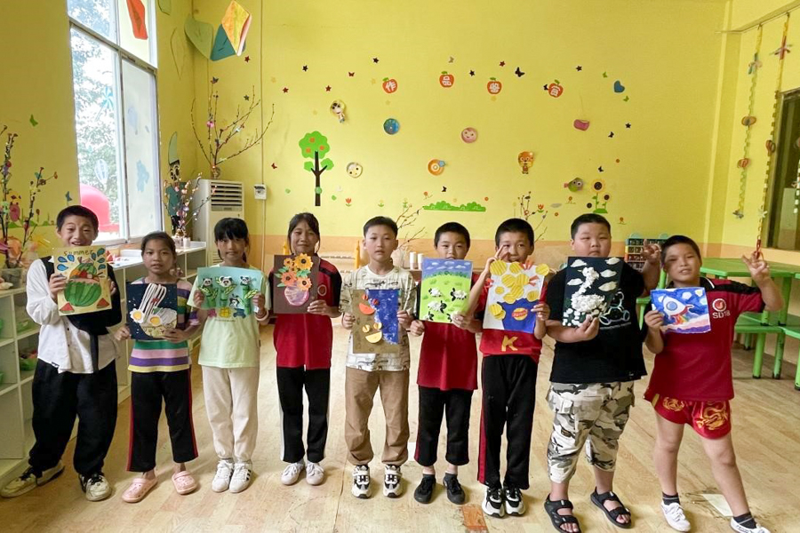 “你笑起来真好看,像春天的花一样”一首轻快的《你笑起来真好看》,搭配着口语操,立刻拉近了志愿者与孩子们的距离。接下来,在“七彩未来”主题创意美术课上,孩子们用上了平时不多见的七彩颜料和画笔,尽情发挥着想象力。小坤同学把浪花画成了黑色,将沙滩涂成了紫色,还把大螃蟹绘成了绿色。他说“我没有见过大海,我的梦想就是去见见真正的大海。”在“我是非遗小传人”活动中,志愿者们组织孩子们沉浸式学习我国非物质文化遗产——竹编团扇的做法,近距离接触优秀民族文化,培养青少年文化自信。在心灵驿站小课堂上,志愿者小柳遇到了一位因不满父母将他留在学校而叛逆的孩子,经过他耐心疏导,孩子理解了父母的苦衷。他们许下约定,一定要好好学习考上普高。