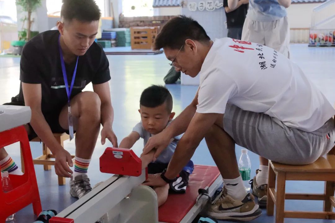 团队成员协助小朋友测试坐位体前屈