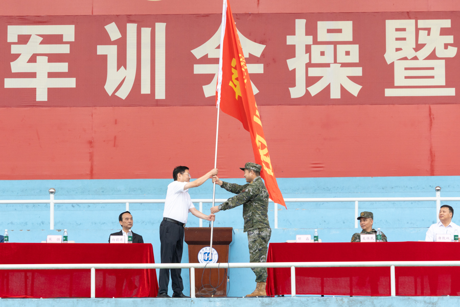 宋强与邓磊进行军训团团旗交接。