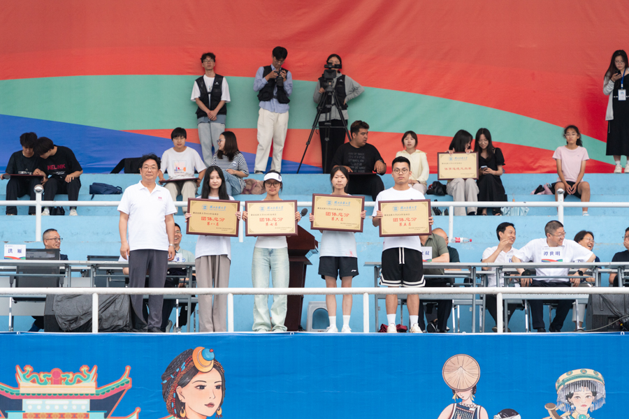 学校党委委员、党委宣传部常务副部长罗翔宇宣布本届运动会宣传工作奖获奖名单。文学与传媒学院荣获宣传工作一等奖,经济与管理学院、马克思主义学院、化学与环境工程学院获得二等奖,法学院、外国语学院、数学与统计学院、生物与食品工程学院、体育学院获得三等奖。