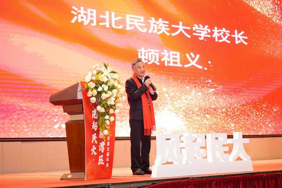 顿祖义对粤港澳大湾区校友会年会暨换届大会的成功举办表示热烈祝贺,对关心支持民大事业发展的广大校友表示衷心感谢。他介绍了学校发展目标、办学实力和校园建设等方面的发展变化情况。他指出,广大民大校友是民大闪耀在粤港澳大湾区的靓丽名片,民大校友身上散发出来的创业创新创造品质,生动诠释了“博学、博爱、立人、达人”民大校训的核心要义,也极大丰富了“艰苦奋斗、甘于奉献、自强不息、追求卓越”民大精神的深刻内涵。他期待粤港澳大湾区校友会秉持服务校友、服务母校、服务恩施的理念,用心、用情、用力,持续做好校友资源联络拓展、校友力量凝聚强化、助力母校事业发展等各项工作,继续引领民大地方校友会走向新高度、创造新辉煌。