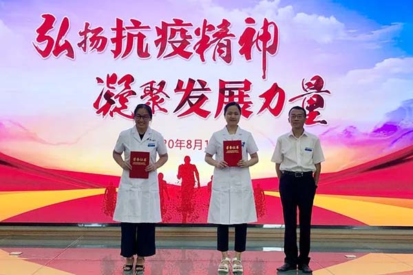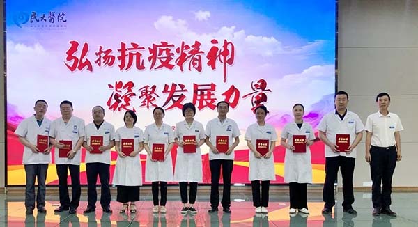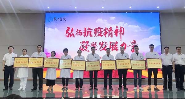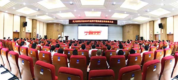 本网讯 为庆祝2020年中国医师节,全面总结医院抗疫阶段性工作,8月18日下午,我校附属民大医院举行2020年医师节暨抗疫总结表彰大会。学校党委常委、副校长邓磊出席,医院领导以及临床医技科室、行政职能部门主任,党支部书记、援汉医疗队、下县包片专家、临床医技科室医师代表及获表彰人员参会。医院党委副书记邹莉主持会议。