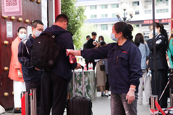 宿管阿姨为新生测量体温