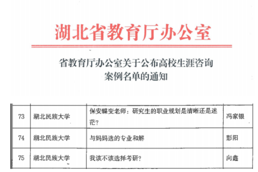 7月9日,湖北省高校生涯咨询案例评选结果揭晓,开云电竞官方网站入口研究生处冯家银老师申报的《保安蝶变老师:研究生的职业规划是清晰还是迷茫?》,研究生处向鑫老师申报的《我该不该选择考研?》,法学院彭阳老师申报的《与妈妈选的专业和解》等3个案例成功入选。