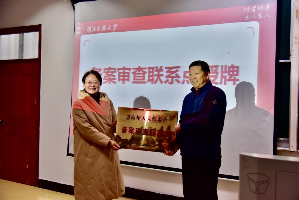 现场举行了备案审查联系点授牌仪式。吴以忠向恩施州立法研究与人才培养基地颁发牌匾,基地负责人汪燕代表基地接牌。最后,学校党委委员、党委宣传常务副部长罗翔宇宣布本次“宪法宣传周”正式开幕。