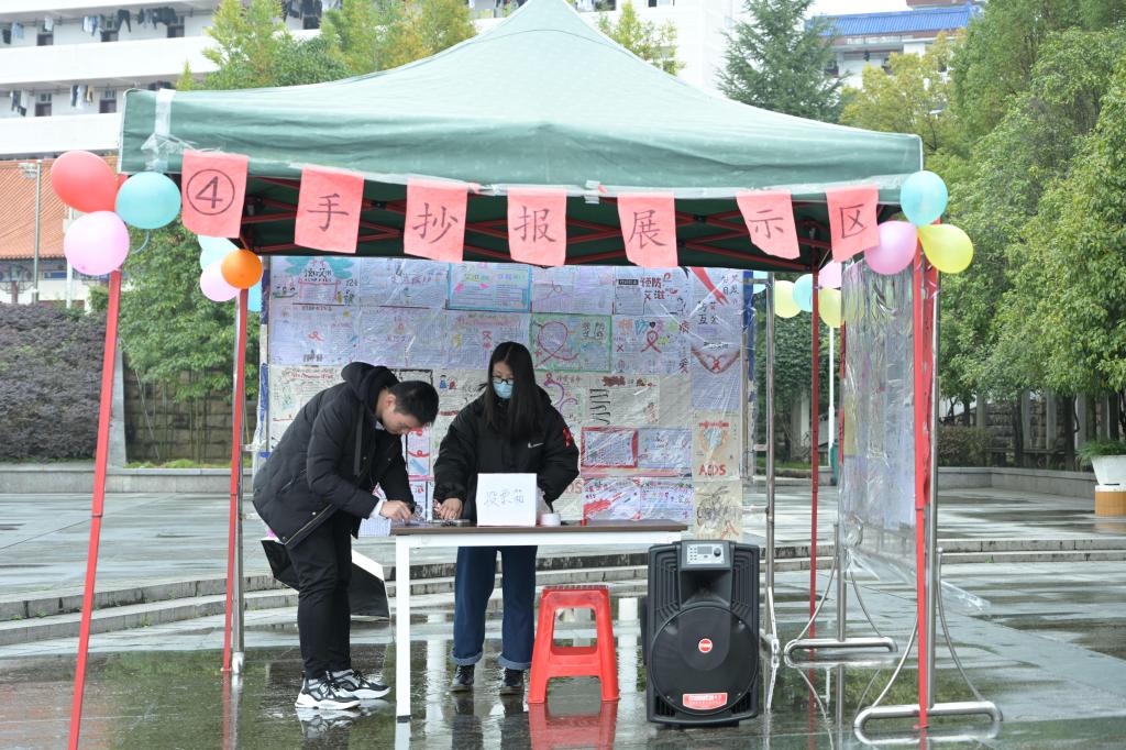 本次活动共设有手抄报展区、场景模拟测试区、知识竞答区等五个站点,活动形式新颖,内容丰富,现场气氛活跃。手抄报展区悬挂防艾主题手抄报,其形式各异,吸引众多学生驻足观看;场景测试环节,通过一系列的场景表演,加深参与者对艾滋病的理解,使其深刻认识知艾防艾的重要性;知识竞答环节,考验参与者对艾滋病知识的了解,此环节中参与者或冥思苦想,或对答如流。同时,现场工作人员向学生发放红丝带和宣传手册,并为参与者详细讲解艾滋病相关科普知识。