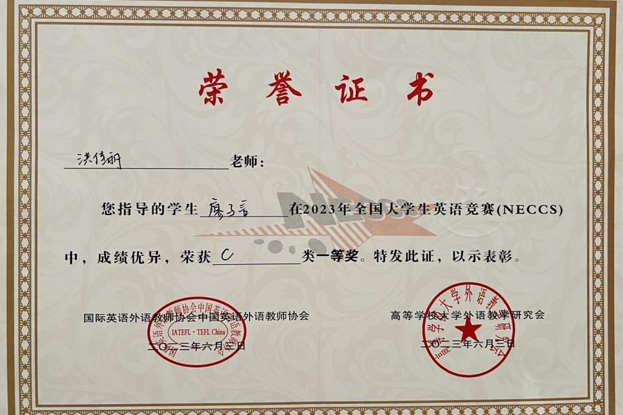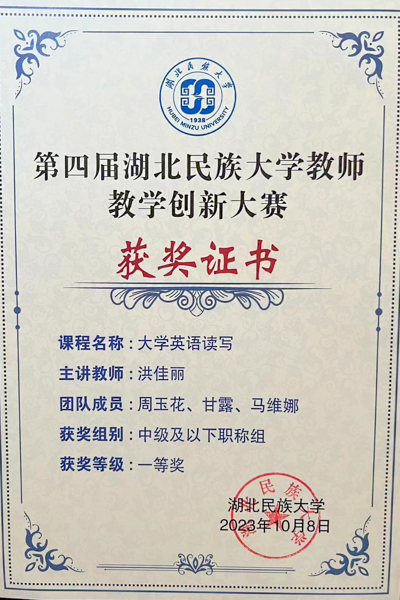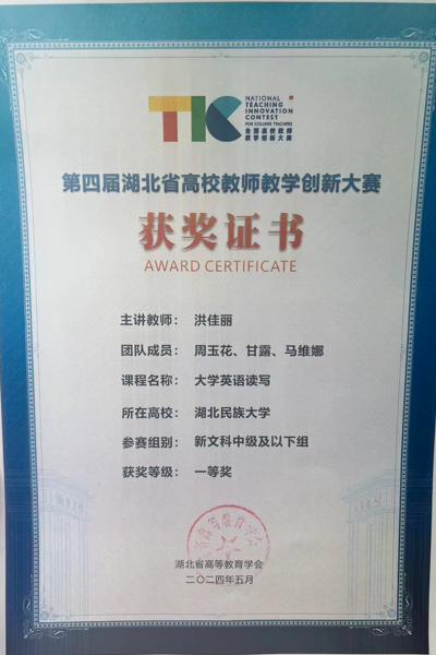 主讲课程《大学英语读写》于2023年11月获批省级一流课程。荣获第13届外“教社杯”全国高校外语教学大赛(大学英语)听说组湖北省二等奖、第四届开云电竞官方网站入口教师教学创新大赛一等奖、第四届湖北省高校教师教学创新大赛新文科中级及以下组一等奖。主持横向课题1项,发表多篇学术论文;指导学生多次参加国家、省级大学生英语竞赛并获得优异成绩。