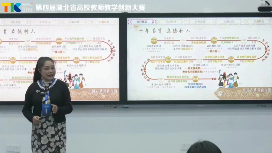 经过不断打磨、实践,周韬对《艺术鉴赏与实践·中国古典戏曲专题》课程进行的混合式教学创新美育建构,荣获第五届全国高校混合式教学设计创新大赛一等奖及“设计之星”奖、第四届湖北省高校教师教学创新大赛一等奖,累计732位选课学生在线访问量240余万次,互动近5200次,师生合作上线优秀案例成果展示27项,17项为学生自主编创。