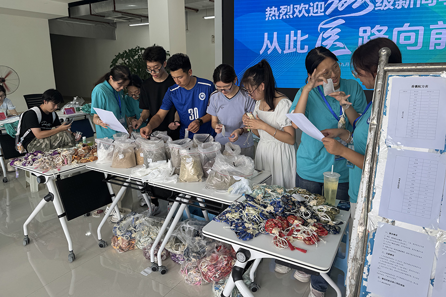 更具互动性的中医药香囊DIY区,则成为迎新活动的“人气打卡点”。为确保香囊的专业性与实用性,医学部组织专业教师团队反复研究配方,针对不同需求设计了芳宁心悦、疏肝解郁、理气醒神、安神四款特色配方,既能舒缓情绪、改善状态,还能起到驱蚊防热的实用功效。活动中,专业老师现场讲解每种配方的药材功效与搭配原理,新生与家长围坐在一起,亲手将艾叶、藿香、薄荷等中药材装入香囊袋,穿绳、封边,在动手操作中近距离接触中医药知识。
