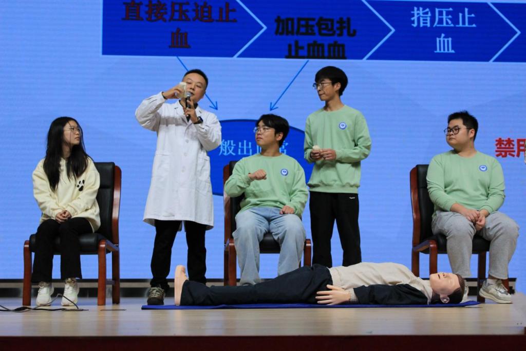 张先锋围绕徒手心肺复苏、止血包扎、烧烫伤处理、气道异物梗阻四大板块开展培训。他以“有人晕倒该怎么办”切入,拆解心肺复苏的按压手法、点位、深度等关键步骤,现场引导师生、宿管上台实操练习;针对不同类型外出血,直观演示止血包扎技巧,强调骨折伤口包扎的固定要点;明确烧烫伤“冲、脱、泡、盖、送”五步骤,并通过动画短片演示海姆立克他救与自救手法。