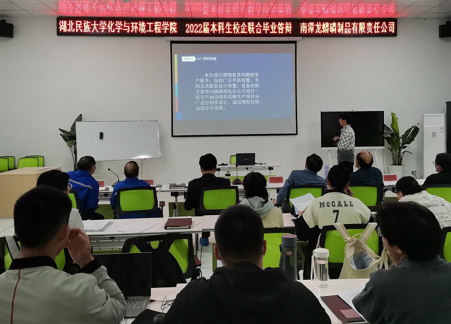 5月14日,化学与环境工程学院在湖北襄阳南漳龙蟒磷制品有限责任公司举行“校企联合”毕业论文答辩会,特别邀请企业代表作为答辩委员会专家,为化学工程与工艺、制药工程专业在该公司实习的11名毕业生进行了一场特别的毕业论文答辩。据了解,此次参与答辩毕业生的毕业论文大多在企业实习过程中完成,根据疫情防控的要求和专业实习的实际情况,为加深企业对高校人才培养的了解,同时也更好地引导学生结合产业实际展开毕业论文的研...